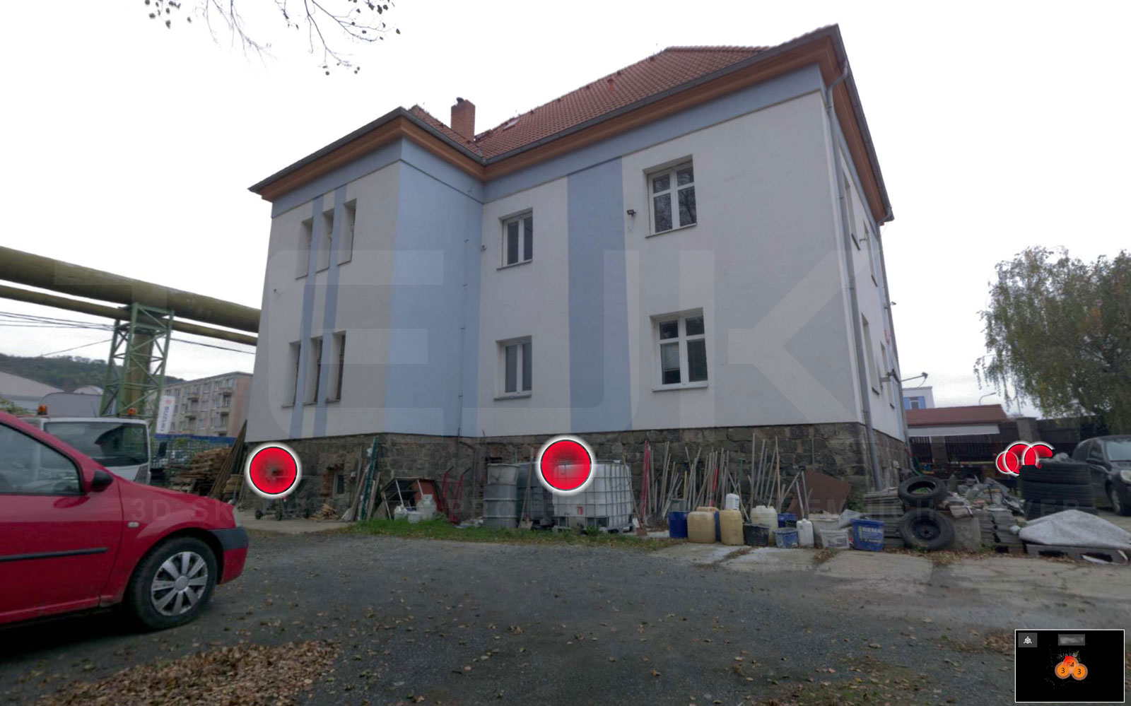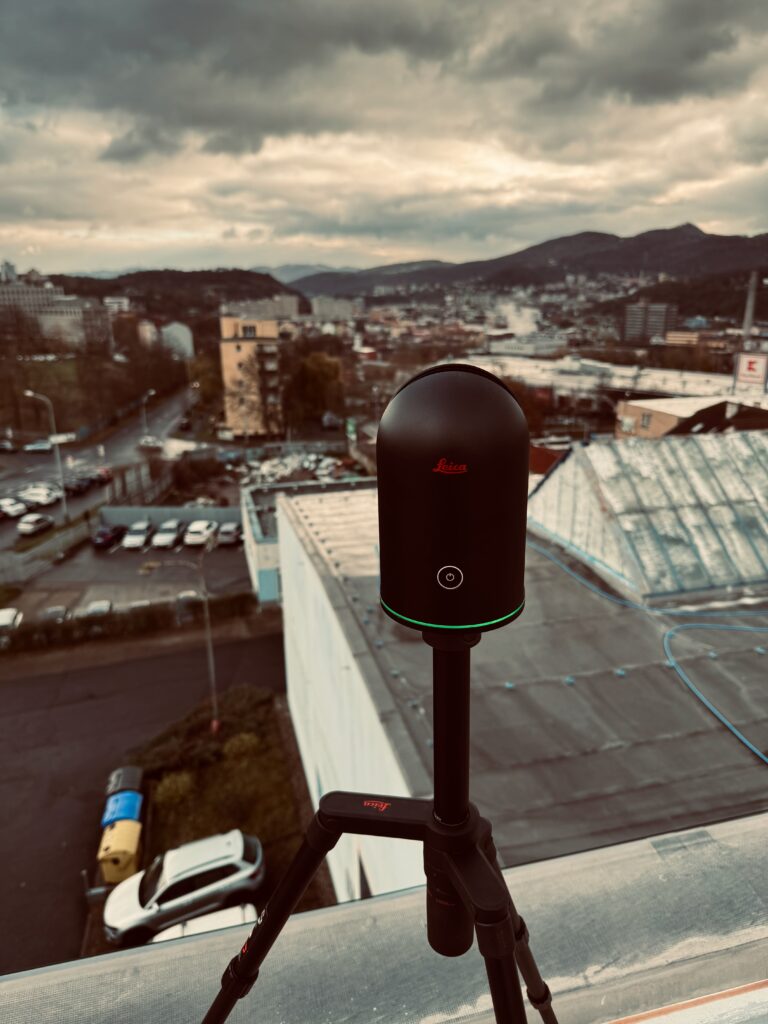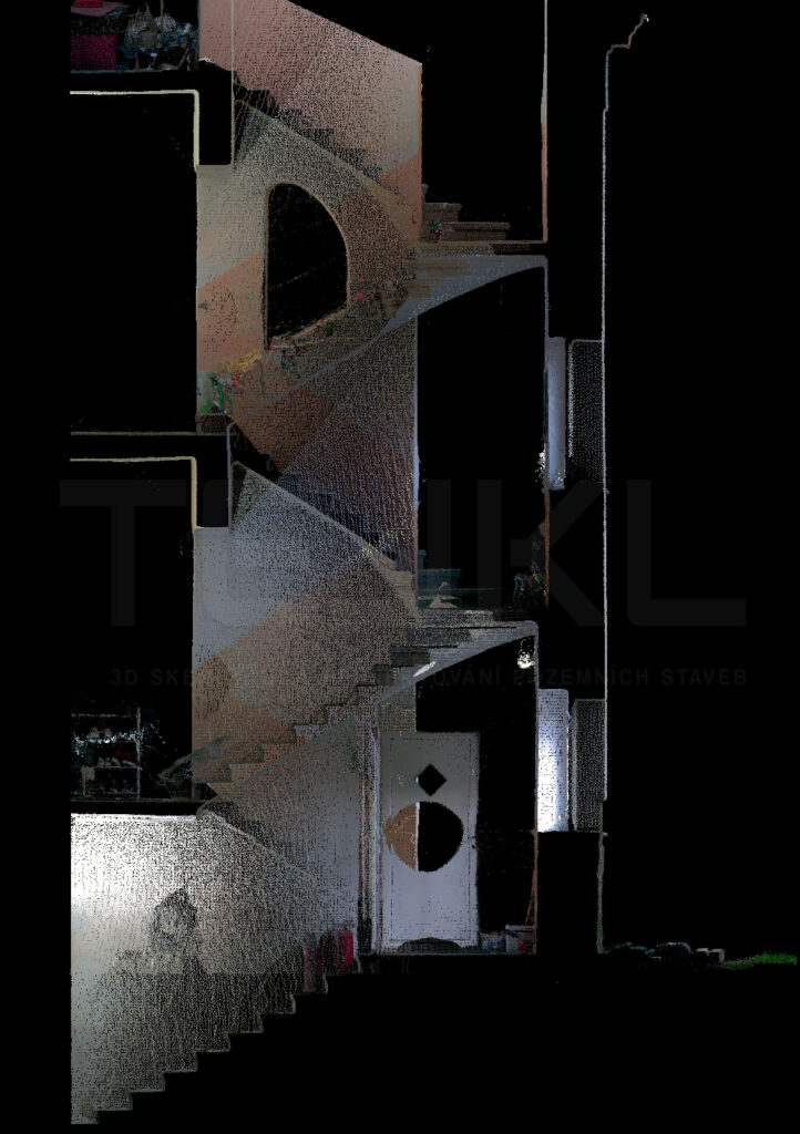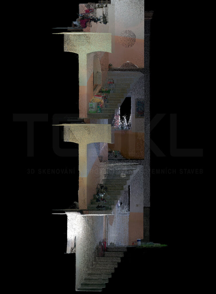 - Výstupem je také 3D model z mračna bodů s panoramatickými fotkami ze všech skenovacích stanovišť.
